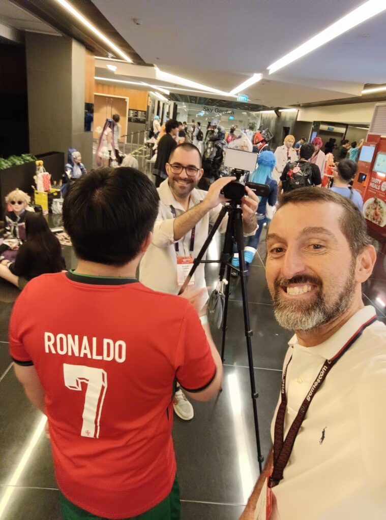 Não imaginam nossa surpresa ao encontrar um cosplayer de Cristiano Ronaldo CR7, que apesar da minha insistência sobre a seleção brasileira, Ronaldo Fenômeno, Ronaldinho, Pelé e etc ele não se deixou vencer e ainda fez o famoso pulo e grito do CR7… 😀