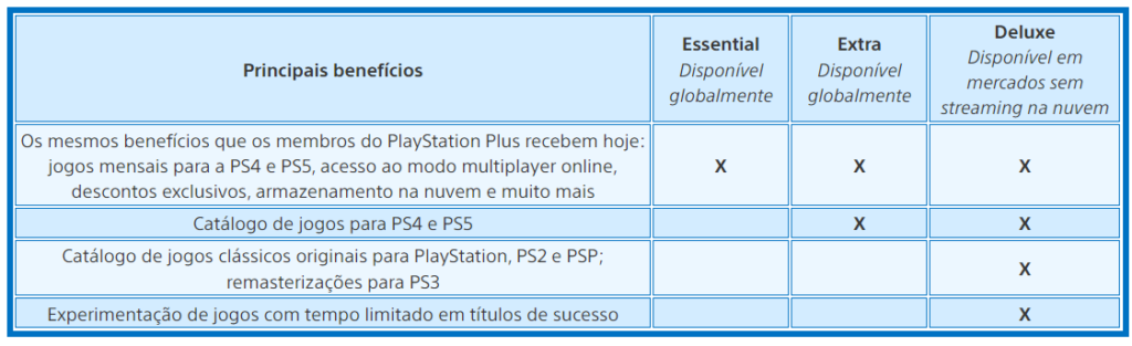 Para o PlayStation Plus, os benefícios permanecerão os mesmos na primeira opção de plano, que foi reformulado como PlayStation Plus Essential. Opções adicionais do plano de benefícios serão adicionadas. Consulte o gráfico acima.