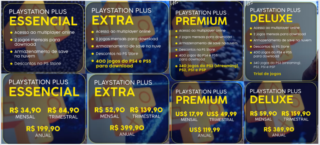 A PS Plus terá grandes mudanças em junho para concorrer com o Xbox Game Pass, da Microsoft. Segundo os primeiros detalhes, o serviço do PlayStation 4 (PS4) e PlayStation 5 (PS5) contará com três níveis de assinatura com seus respectivos benefícios e preços, sendo eles: Essential (R$ 34,90), Extra (R$ 52,90) e Deluxe (R$ 59,90). O plano mais simples é igual à PlayStation Plus atual, que segue sem mudanças no preço praticado. Já os demais trazem um catálogo com centenas de jogos como Death Stranding e God of War, além de clássicos do PSOne, PS2 e PSP.
