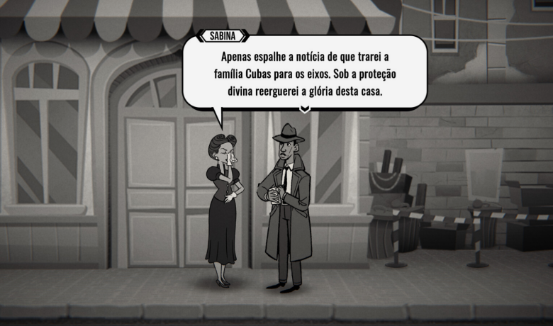 Então vamos ao jogo, em modo tela cheia para “saborear” o visual que, diga-se de passagem, é muito bem elaborado, bem noir. Admito que não lembro de ter lido o livro original na adolescência, não pretendo ler nos próximos anos e torço para que isso não interfira na minha compreensão do game.