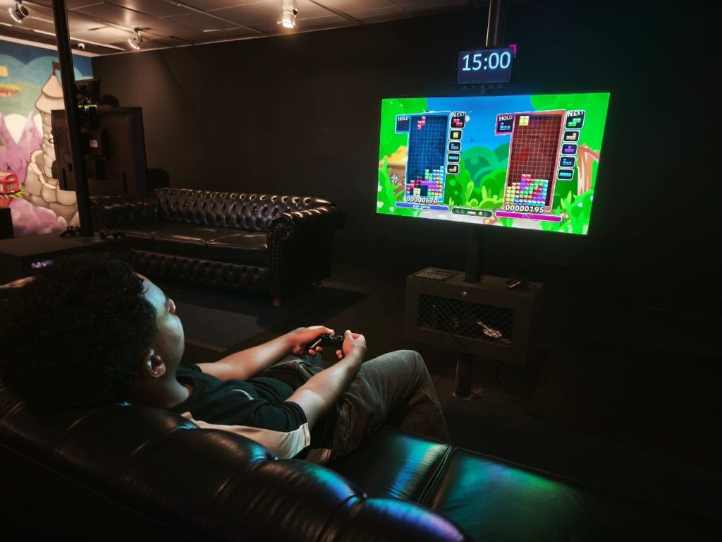 No andar de baixo encontra espaços voltados ao coletivo, com movimento e dança como “Just Dance” ao mesmo tempo tendo zonas para aquele tradicional duelo de sofá igual era antigamente: só faltou a pipoca e suco!