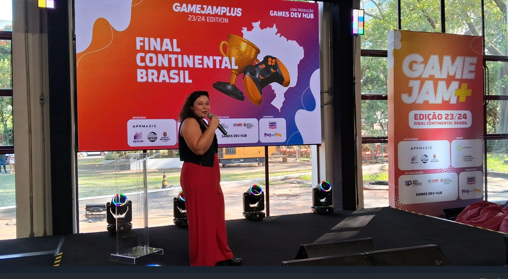 “Ele começou a Game Jam Plus em uma cidade do Rio de Janeiro, com pouquíssimos participantes e vem crescendo, com a colaboração desses incríveis voluntários que estão aqui com a gente e, nessa edição, a gente teve 4.500 participantes”, declarou a jovem no palco, destacando a incubação de 450 jogos nos últimos dois meses, dentro da ação realizada este ano.