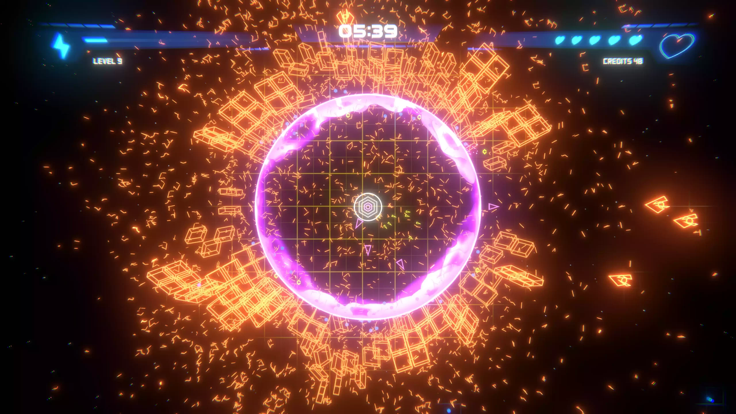 Uma diferença é que, aqui, há apenas um golpe fatal. Sua nave não possui uma barra de energia; você começa com 3 corações, representando suas vidas. Se colidir com os inimigos, perde uma vida, como em Geometry Wars.