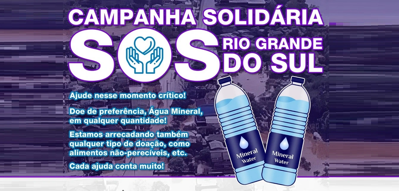 A campanha “Campanha Solidária – SOS Rio Grande Sul” está angariando garrafas de água mineral e outros suprimentos para serem enviados como assistência humanitária ao Sul do país como forma de atenuar a catástrofe que assola a população da região.