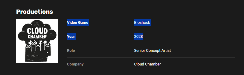 De acordo com o perfil de Mack Sztaba no ArtStation, que é um artista conceitual sênior da Cloud Chamber, foi descoberto que ele está envolvido com o projeto BioShock e menciona que o jogo está previsto para ser lançado em 2028.